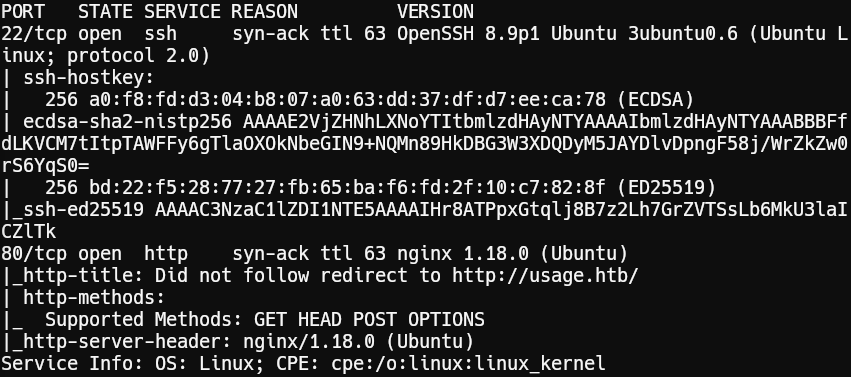 Ports 22 (SSH) and 80 (HTTP) are open. The web server redirects to usage.htb.