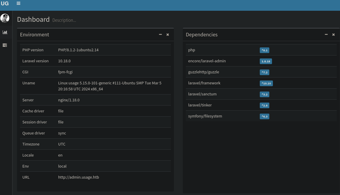 Using admin:whatever1, we logged into http://admin.usage.htb and discovered the site was running Laravel Admin 1.8.18, vulnerable to CVE-2023-24249 (arbitrary file upload).
