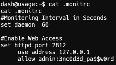 After some manual enumeration we found a password in /home/dash/.monitrc.